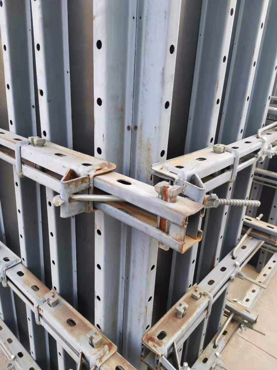冷軋鋼材質(zhì)的豎梁和橫梁相比方木不會出現(xiàn)熱脹冷縮的情況,保證澆筑體的平整度和整個(gè)模板支撐體系的安全(絕不會出現(xiàn)跑漿漏漿情況)。過口和墻體連接處陰陽角的設(shè)計(jì),解決了傳統(tǒng)方木模板支撐的難題,保證了墻體的楞度和角度。由于興民偉業(yè)的豎梁是可伸縮,橫梁和可對接的,從根本上解決了傳統(tǒng)方木支撐的接頭、木屑的雜亂堆放,保證了工程的美觀,提升了工程形象。